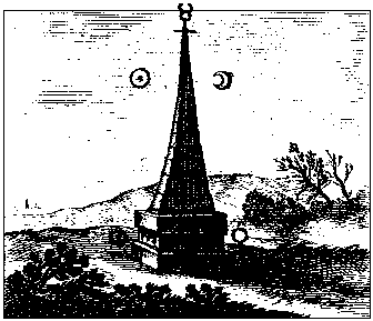 A slender pyramidical tower stands in an open landscape. At its tip is the symbol of Mercury, while the Sun and Moon stand on the left and right respectively. At its base is the symbol of Salt on the left, and ? on the right.