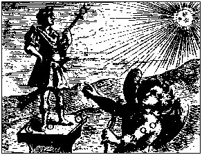 Cupid with his bow and arrow bears the symbols Saturn, Jupiter, Venus and Mars on his left arm, and [] on his head, and points with his right hand to a statue on a plinth. This statue has a rod with the symbol of Mercury at the tip, and at its feet on the top of the plinth are the symbols of Moon, Antimony, and Sun. On the right a Sun shines out.