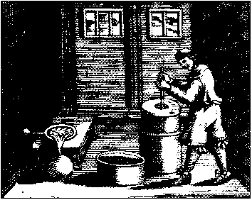 On the right a man works a pestle in a large mortar. Liquid pours from flat vessel on table into round receiver.