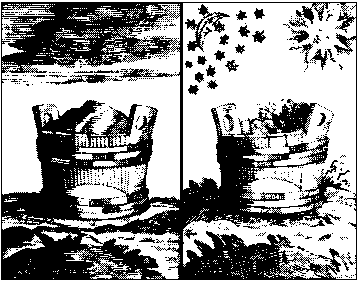 Illustration is split into two parts. On the left a wooden bucket full of earth stands on an open plain. On the right a bucket full of vegetation stands under the Moon, Sun and Stars.