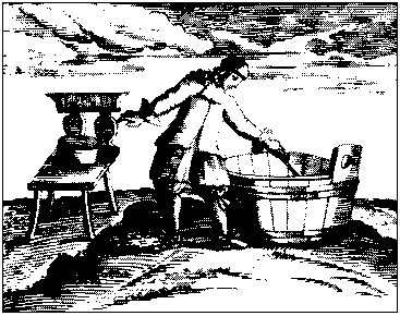 A man stands and stirs the contents of a large wooded bucket. Beside him is a small bucket on a chair.