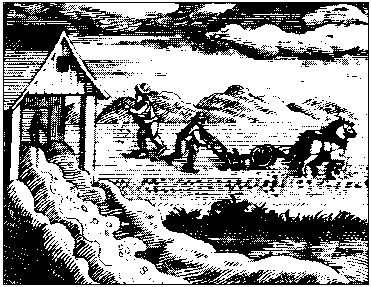A man ploughs a field while behind him another casts the seed. On the left is a hut within which a man is seen.
