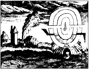 On the left is a tower and a low round wall like that around a well. From this well a pillar of smoke arises. On the right is a strange egg shaped enclosure with the pans of a scales. This is set on a hemispherical shape with what could be a space below for heating up the egg shape above.