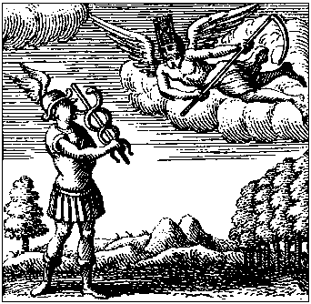 The figure of Hermes or Mercury wearing his winged helmet stands holding his caduceus in his right hand. In the air above winged Saturn or Chronos approches, complete with hour-glass on his head, and holding his scythe.