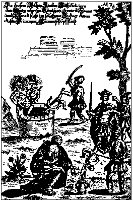 On the right under a tree, four soldiers with swords are killing children, and throwing the bodies into a well on the left. Beside the wall of this well stand two figures, one Sun-headed and the other Moon-headed. One of these seems about to enter the well. In the foreground a woman collects the blood of one of the infants into a jug, or vessel. On the left beside her a plant with two flowers grows.