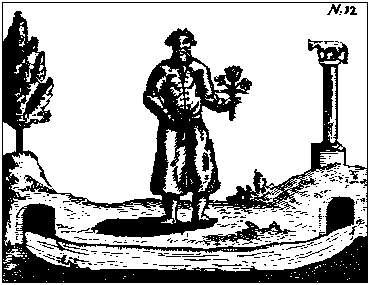 A man stands holding a triple blossomed plant in his left hand. It has a tulip-like flower and two four-petalled flowers on either side. On the left is a small hill with a tree growing on top, while on the right is another small hill on which stands a classical column on the top of which is a lamb or sheep. A stream runs between the two hills from out of a cave, at the foot of each hill.