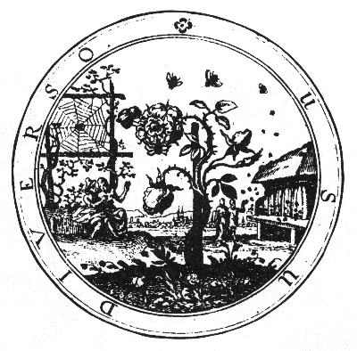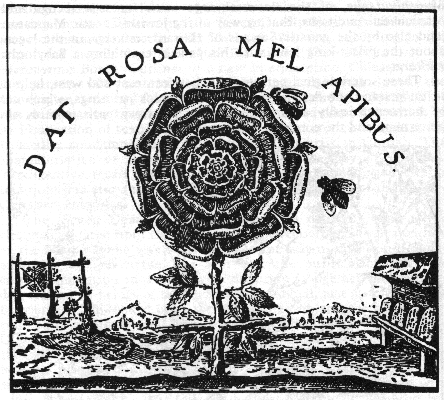 The rose symbol from the titlepage of Robert Fludd's Summum Bonum, published at Frankfurt in 1629, has become well known as a Rosicrucian symbol. It has a sevenfold symmetry, seven layers of petals and its stem is formed in the shape of a cross. However, it appears that this design was not entirely an original conception for Fludd's book, as the engraver, Matthieu Merian, had used a similar grouping of symbols fourteen years earlier in an emblem book which he illustrated.