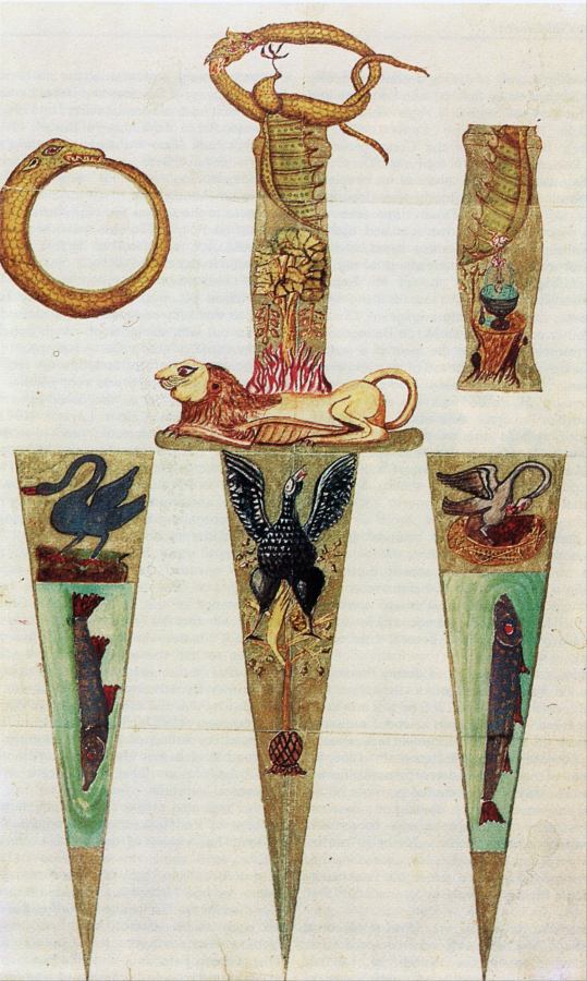 Before you are three crosses that represent the triple Mercury, which contains threefold the four elements of nature. You will dig in the virgin adamic earth with the tip of this glaive, which is the iron born of the same earth, and you will plant the glaive therein, which is the triple fire of Hermes. You will turn it into the philosophical steel by quenching it with the permanent water. The tip of the glaive is of gold and fire. Carefully observe the philosophical tree, whose root is a saturnian fruit, the apple of sulphur, containing the sulphurous Saturn-Mars (here in the form of symbols) and recalling Venus (here in symbolic form) by its vitriolic flowers. You will imitate the figure of the world and that of the egg and you will hatch the dry earth from the moist earth. These are the two methods, which must not be confused, but must be united and in whose use you cannot err. The hen will sit on her egg for forty days, in her nest of dung and she will lift up her wings little by little, becoming white-coloured, and then bloodletting like the pelican. Thus, you will angle for the two fishes of running water, and you will feed them to the crow, which will become the white swan. There are two green dragons that devour one another and that become one, and there is a tree whose root is watered with fire. There is a fire which is an earth and a water, yet the earth is not earth, it is a stone, and if it is not a stone it is a metal, and yet it is not a metal. We must grind it and decoct it without burning it, for there is coldness in winter and it hides in the cave or becomes valiant like Job. But you will gather its leprosity with the philosophical test and you will put it in the cask of the vintage of Mars. The batch will ferment and you will first obtain the white salt of tartar, which will change into cream of white wine, then from the dregs, sprinkled drop-by-drop with the milk of the vine, you will extract the red blood. From the new wine, you will mix and marry the two serpents and decoct the green dragon by the fire of the lamp of Hermes until it becomes black, then white, then citrine, then red; this done, you will marry the new red with the preserved portion of the first white in the same manner as in the beginning and in the proportion of three moons for one sun, and you will obtain ten from one, a hundred from ten, a thousand from a hundred, ten thousand from a thousand and one hundred thousand from ten thousand. Thus, may God help you, and you will achieve victory with the glaive of Mars. The sheath that you see depicted in this tableau, offers the most faithful image of your ditch, there lives the pelican, swan of earth and water; the lyon is the hilt, and the pommel, the work... The nest of the pelican, dung-built, the crow that changes into a quite pure dove, and of a network of iron, the globe surrounded, hiding the great secrets of art and nature. If you have problems understanding these alchemical texts, Adam McLean now provides a study course entitled How to read alchemical texts : a guide for the perplexed. |