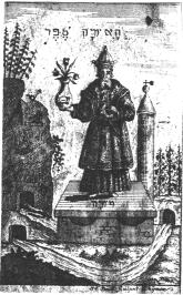 1. Frontispiece engraving. 146x92mm. A hebrew priest stands on a square plinth and holds a flask in his right hand inside of which a serpent seizes its tail forming an ouroboros. From the neck of the flask three tulip-like flowers emerge. On the left is a high cliff with trees or plants growing on the summit. At its foot are two caves. An animal is entering one of these caves, while from the other a stream or river emerges (or enters). This stream passes beneath the figure of the priest and enters a cave or tunnel in a small mound on top of which are three vines with grapes. On the right beside and behind the priest's plinth is a circular tower surmounted with a globe and cross.