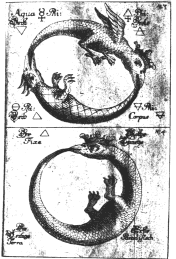 34. p84 Woodcut in text. 36x30mm. A six-legged dragon seizes its own tail in the ouroborus.
