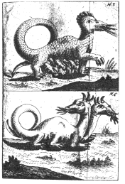 59. Inserted at end of volume. Engraving. 141x94mm. No. 5. A strange dragon blowing a wind or fumes from its mouth walks across a plain. Its small children suckle at its breasts. No. 6. A two headed dragon with six legs, breathes forth fire from each of its mouths.
