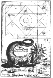 60. Inserted at end of volume. Engraving. 142x94mm. No. 7. A hexagram is inscribed within a rectangle. In each of the vertices of the hexagram are Salt, Sulphur, Mercury and Spirit, Soul, Body. In the corners of the rectangle are the symbols of the four elements. No. 8. A strange dragon sitting on the ground has a sun like head. It is labelled 'Baal'.