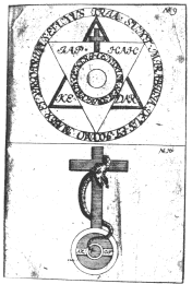 61. Inserted at end of volume. Engraving. 141x94mm. No. 9. A pair of triangles are inscribed in a circle. The circle has "Tria sunt mirabilia; Deus et homo ; Mater et virgo; Trinus et unus" There are three marvels - God and Man - Mother and Virgin - The Three and the One. The triangles are labelled 'Japhah' and 'Kedar'. Inside these triangles is a circle with a cross at the top. The circle has 'Trigon centri centrum set'. and another smaller circle at its centre. No. 10. A serpent is crucified on a cross which stands upon a circle labelled 'Azoth'.