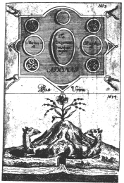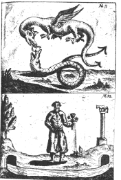 62. Inserted at end of volume. Engraving. 144x94mm. No. 11. A crowned flying dragon breathing fire attacks a serpent or snake lying on the ground. No. 12. A man stands holding a triple blossomed plant in his left hand. It has a tulip-like flower and two four-petalled flowers on either side. On the left is a small hill with a tree growing on top, while on the right is another small hill on which stands a classical column on the top of which is a lamb or sheep. A stream runs between the two hills from out of a cave, at the foot of each hill.