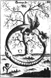 2. Inserted after p8. Engraving 142x94mm. No. 1. In front of a tree bare of leaves, two serpent dragons seize each other's tail and form an ouroboros. The upper snake is winged and wears a crown. On the left foreground a tulip-like flower is growing.