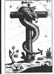 9. Inserted after p26. Engraving 141x94mm. No. 2. A serpent is crucified on a cross. In the left foreground a tulip-like flower is wilting, it flower bending to the ground. Immediately behind this a tree stump sprouts new leaves.
