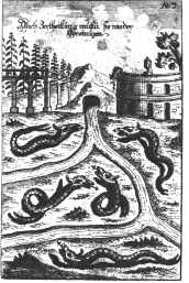 16. Inserted after p44. Engraving 142x92mm. No. 3. A river flows from out of (or into) a cave or tunnel below a hill. On the left of this hill is a viaduct, behind which a row of trees grows along a ridge. On the right is a circular walled garden, within which a tree is seen. On an open plain the river or stream forms tributaries, and beside it five snakes or serpents crawl on the ground.