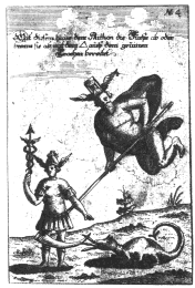 24. Inserted after p62. Engraving 141x94mm. No. 4. The figure of Hermes or Mercury wearing his winged helmet stands holding his caduceus in his right hand. He is attached from the ground below by a three tongued dragon (possibly breathing forth fire or flames), and also from the air above by Saturn or Chronos, complete with hour-glass on his head. Saturn with his scythe tries to cut off the legs of Mercury.