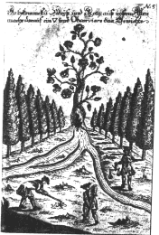 30. Inserted after p78. Engraving 143x96mm. No. 5. An avenue with seven trees on either side, leads to a large rose bush with seven blossoms. Two streams (one forked) pass down this avenue to the foot of the rose bush. Two workmen dig and hoe the earth in this garden, while on the right a man stands holding a balance or set of scales.