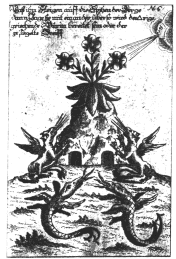 40. Inserted after p94. Engraving. 142x94mm. No. 6. A triple blossomed flower grows on the top of a high mountain. From the right a wind blows on it from a cloud above, while below two winged griffins blow breaths of wind from their mouths towards the plant. Beside the griffins at the bottom of the mountain are two caves. In the forground two winged serpents or snakes, lie on the ground. They have triple forked tongues (or possibly are breathing forth fire or flames).