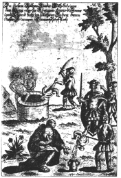 45. Inserted after p108. Engraving 142x96mm. No. 7. On the right under a tree, four soldiers with swords are killing children, and throwing the bodies into a well on the left. Beside the wall of this well stand two figures, one Sun-headed and the other Moon-headed. One of these seems about to enter the well. In the foreground a woman collects the blood of one of the infants into a jug, or vessel. On the left beside her a plant with two flowers grows.