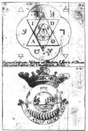 57. Inserted at end of volume. Engraving. 142x94mm. No. 1. The signs of the four elements are set in a square. Within this is a four lobed circular form, inside which is a hexagram or seal of Solomon. In the six triangular vertices is the six lettered name of God ADONAI, while around the hexagram are six letters in an angelic alphabet. At the centre of the hexagram is a circle with an inscribed triangle. Around the triangle are the symbols of Mercury, Sulphur and Salt, and inside it is a further circle , at the centre of which is a small circle surmounted with the letter 'T'. At the bottom is "The central sign of Nature is the essential tincture and oil. Mercury, Sulphur, Salt ". No. 2. A circle has a crown set over it and a label below with the Tetragrammaton 'Azoth' and 'Confusio'. Inside the circle at the bottom are flames of fire, while at the top is a triangle of light. From the left and right of the circle two winds blow. In the centre of the circle is inscribed another circle inside of which is the scene of a river flowing from (or to) a cave under a mountain on the left across a plain, on the right side of which is a smaller hill upon which a line of trees are growing.