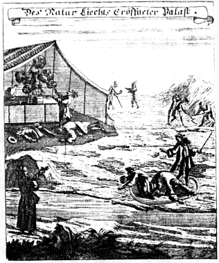 1. Inserted before page 1. Engraving. 153x129mm. "Des Natur Liechts Eröffneter Palast". An alchemist performs an experiment in a tent, while two men lie as if dead on the ground. In the background two men prospect for minerals, and beside them three men dig the ground. In the foreground three men perform a conjuration in a magical circle, and on the opposite bank of a river a woman holds up a herb she has gathered.