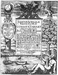 Erster Theil Joannis Agricolæ. Commentariorum, Notarum, Observationum & Animadversionum in Johannis Poppii chymische Medicin, darinnen alle Process mit fleiss examinirt, von den Irrungen corrigirt, und mit etlich hundert newen Processen, geheimen Handgriffen, aus eigener Erfahrung vermehrt und illustrirt, Auch der rechte und warhafftige Gebrauch der Artzeneyen, mit etlich hundert Historien verificirt, Darneben was in Chirurgia und Alchimia oder transmutatione metallorum damit zu verrichten gründlichen offenbahret allen Standes-Personen, Medicis, Chirurgis, Chymicis, Balbirern, Feld-Scherern, Ross-ärtzten, Goldschmieden, und allen Haus-Wirthen hochnützlich zu lesen und zu gebrauchen.