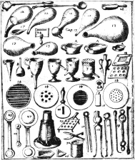 41. p272 Engraving. 156x133mm. Various items of apparatus, filtering funnels, retorts, tongs, ladles, etc.