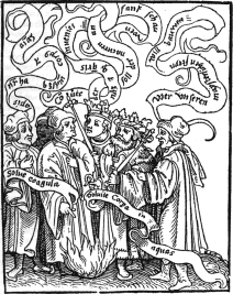 2. f1r Woodcut of titlepage of Rosarium philosophorum. 110x88mm. Six philosophers hold a discussion. One points to a fire burning on the ground. Banners proclaim "solve coagula" and "solvite corpora in aquas".