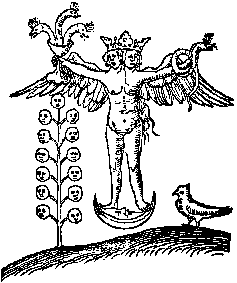 12. f48r Woodcut 10 of Rosarium series. 107x88mm. A winged hermaphrodite stands upon a Moon and holds in its right hand a chalice or cup within which are three snakes. In its left hand it holds a coiled snake or serpent. On the left of the hermaphrodite is a Moon tree with 13 Moon flowers. To the right is a crow.