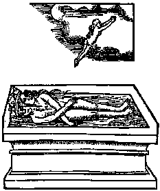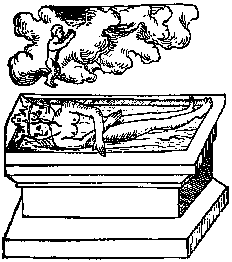 18. f77v Woodcut 16 of Rosarium series. 104x88mm. The Reviving. The hermaphrodite or conjoined King and Queen still lies as if dead in a sepulchre. A small female spirit descends from the clouds above.