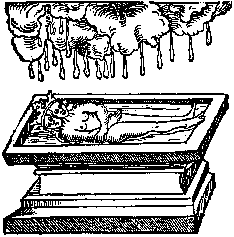 17. f73v Woodcut 15 of Rosarium series. 89x89mm. The Multiplication. The hermaphrodite or conjoined King and Queen still lies as if dead in a sepulchre. Drops of rain descend on the body from the clouds above. (Compare with emblem 8).