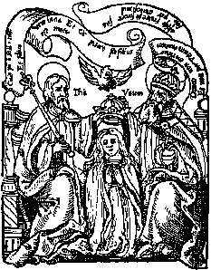 21. f90v Woodcut 19 of Rosarium series. 112x88mm. Christ holding sceptre and the Father holding on orb, together hold a crown above the head of a young woman, the Virgin. Above her head a bird of the holy Spirit hovers.