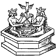 3. f5v Woodcut 1 of Rosarium series. 104x85mm. A fountain stands upon three feet. From three spouts water falls into the basin. The fountain is framed by four six-pointed stars which are placed in two columns of smoke which rise on the right and left of the fountain. Another star is set above the fountain, and is framed by the sun and moon. Above this a double headed dragon or snake attempts to devour the stars.