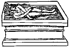 8. f28r Woodcut 6 of Rosarium series. 58x89mm. The Conception or Putrefaction. A hermaphrodite or conjoined King and Queen lies as if dead in a sepulchre filled with water.