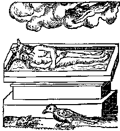 9. f32v Woodcut 7 of Rosarium series. 98x88mm. The Extraction or Putrefaction of the Soul. The hermaphrodite or conjoined King and Queen still lies as if dead in a sepulchre. A small male spirit rises into clouds.
