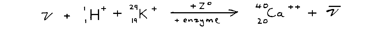 Recently a possible explanation for this phenomenon within the framework of modern physics has been evolved by French physicist Oliver Costa de Beauregard, Professor of Theoretical Physics at the Institut de Physique Theorique Henri Poincare (Faculty of Sciences, Paris) who is also Director of the Centre National de la Reserche Scientifique (C.N.R.S.). Costa de Beauregard suggests that such transmutations neither takes place through strong interactions, nor through electromagnetic forces, but through the weak interaction. This takes place through the neutral current of the intermediate vector boson, the so called Zo, particle recently discovered by particle physicists. Kervran's reaction for a biological transmutation from Potassium (K) to Calcium (Ca) in germinating oats is thus explained as being Initiated by neutrino capture (from cosmic rays) and the weak interaction follows mediated by the Z, neutral current (the Zo probably existing as a virtual particle):-