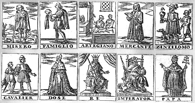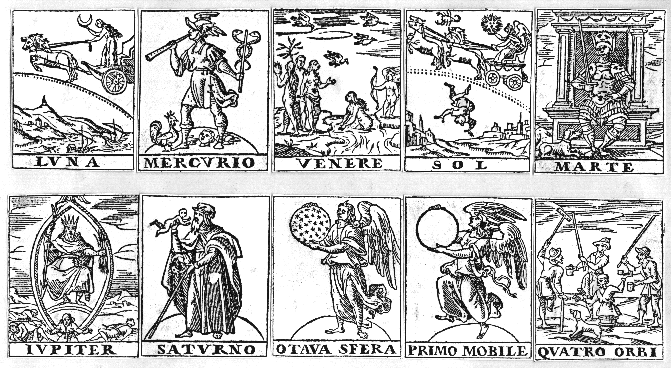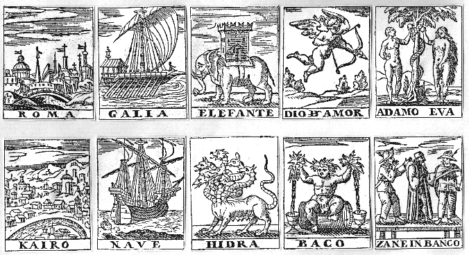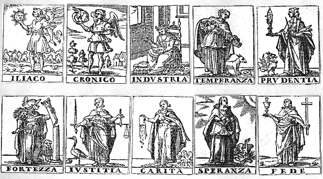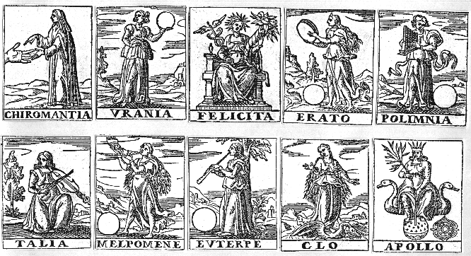 The Labarinto uses this series of 50 images, with a number of minor changes. 'Chiromantia' and 'Felicita' replace 'Calliope' and 'Terpsichore' of the 2nd decade. 'Mathematica' replaces 'Arithmetica' from the 3rd decade, 'Industria' replaces 'Cosmico' in the 4th decade, and 'Quatro Orbi' replaces 'Prima Causa' in the 5th decade. The additional ten images in a similar style seem to be linked in polarised pairs :-