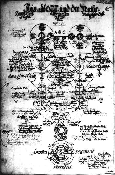 It is obviously impossible to describe all those differences here, as at least one version should be reproduced so that the readers could follow my explanations. In general the Wroclaw Ms seems to be more logical and consonant with the hermetic tradition. For example, on the plate mentioned above, in the central part, there are words, "Sulphur philosophorum" on the left and "Sal philosophorum" on the right. In both Sachse and Hall Mss they are quite prominently written above the lower section of symbols in small circles while in the Wroclaw Ms and in the Altona publication they are placed on top of the two circles closer to the center. The latter placing is obviously correct and in keeping with the symbolic content of the plate. Another example is from the plate "Virgin Sophia", where in the lower right hand corner there are two small circles, one of which contains a symbol similar to Dee's Monas and the other has a double-headed bird (Phoenix, as the text says), in the Hall Ms these symbols are in each other's position, though the texts describing them remain in the original place and thus the "Monas" symbol is described as Phoenix, while the bird is described as a divining rod. The same mistake is repeated once more on the same plate with the circles of "The Raven's Head" and "Incombustible Oil". All the errors of this and similar kinds can be found in all the Mss and the Altona printing but I have not found anything like that in the Wroclaw Ms, which seems to suggest that it may have been the original or a very early copy into which the mistakes had not yet crept in. There is however one point of special interest which confirms my hypothesis that this is the original of all the other D.O.M.A. texts. On the plate entitled "Of God and Nature" (pl. 10 in Hall) there is an inscription added in a different hand (i.e. later) in the lower left hand part. In the other versions (i.e. Hall Ms and Altona) this note is incorporated into the text and moved up to the middle part of the plate. Another note in a different hand, much later and in brown ink, is added in the lower left hand part of the "Figura Divina" plate. It is a reference to the work "Licht (?) der Natur" (I am not sure of the first word) by Anonimus von Schwarz" published in Frankfurt and Leipzig in 1706. As this note does not appear in Hall or in Altona, the Wroclaw Ms must have been copied by others between these two additions were made. Summing up, I suggest that the Wroclaw Ms of D.O.M.A. is the original of all the other texts and was produced in the second half of the 17th century (most probably around 1650).