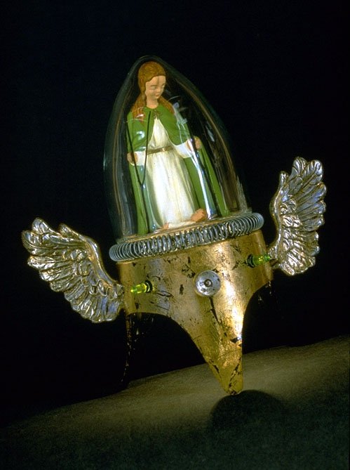 Internally illuminated assemblage with gold/silver leaf and oil paint.