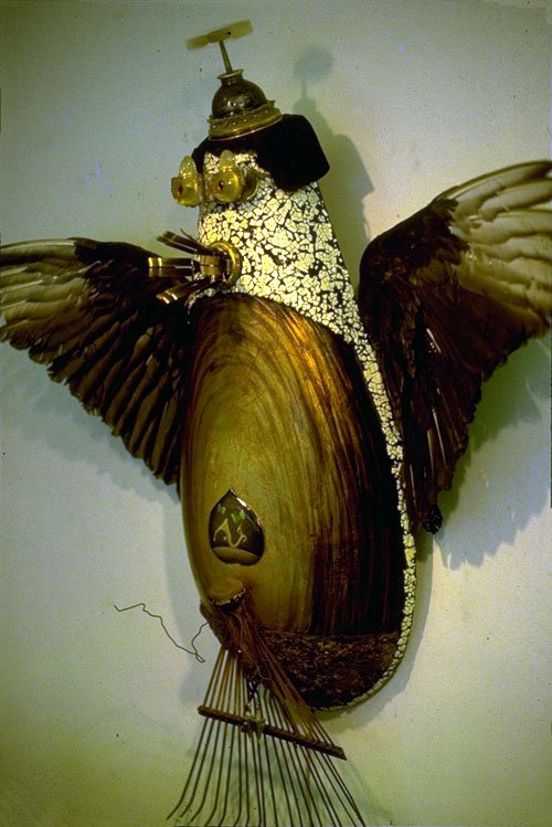OIL, GOLD LEAF, FOUND/ALTERED OBJECTS, EGGSHELL, CASTINGS, ELECTRICAL COMPONENTS, VULTURES WINGS