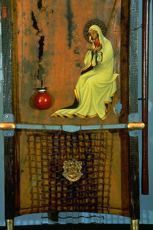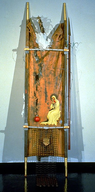 Oil, gold leaf and found objects on stretcher.