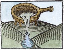 Next we are asked to take this green water and put this into a distillation flask fitted with a still head which should be sealed tightly. This is then placed into a water bath 'with a round certel of lead' attached. What this means is that a lead weight is tied to the base of the flask to keep it upright in the water bath.