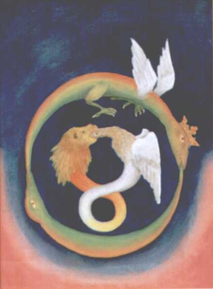 This oil painting is McLean's composite image of the double ouroborus taken from from 17th century engravings.
