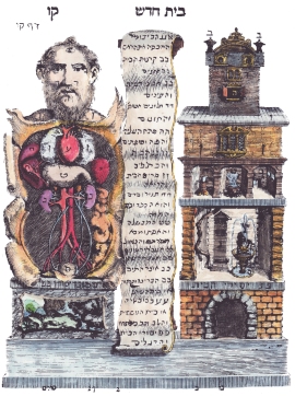 Some years ago I found this interesting emblem from a book by Tobias Cohn, a Polish-Jewish physician of the late seventeenth and early eighteenth centuries. It was included in his Cohn's Ma'aseh Toviyyah, 1707. It is an allegorical emblem paralleling the organs of the body to the parts of a house. I only recently managed to obtain a sufficiently clear reasonable resolution image and have now made a coloured version.