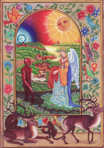 Sadly I have not had any time to devote to my painting for a number of weeks. I have just had so much to do binding up books and dealing with various routine chores. I did manage a few hours to frame up the Paracelsus portrait which I have now put up for sale. I also have a pile of books of illuminated manuscripts to look through and study. I also now have to rework the Solidonius alchemical manuscript images, which I made facsimile paintings of earlier this year. These have to be amended in light of the descriptions of the colouring in the text, which I now have had translated.