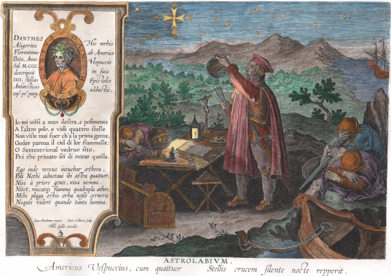 I did manage to free some time at the weekend and completed coloring this interesting 16th century engraving. It shows the Italian explorer Amerigo Vespucci observing the South Cross, and there is a reference to a verse from Dante's Purgatorio Canto 1. This, in Longfellows translation, says: