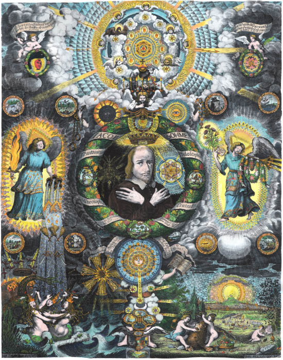 which dates to 1677. He wanted my cooperation to help him sell the print, saying I was an authority on such matters and would have many contacts. Years ago, back in the days of the Hermetic Journal, I had found this engraving and managed to get a reasonable quality photograph from one of the German libraries holding a copy. I dug this out from my archives and immediately realised that it would be a great idea to make an audio visual presentation on this complex engraving. I also thought I might make a coloured version of the image. So I set to work on this. This correspondent then requested my help again. I wrote back asking what was the price he wanted for this. He replied $250,000 ! I was rather amused by this. 17th century engravings do not fetch astronomical prices like this. One can easily find engravings, even with incredibly detailed and skilled work, for $500-1500. One can even buy complete emblem books, each with many large detailed engravings for as little as $2000. There is currently, for example, a copy of the Raphael Sadeleer, Zodiacus Christianus locupletatus, 1634, on sale at the moment for just over $3000, bound with another work and containing 24 wonderful mystical engravings.