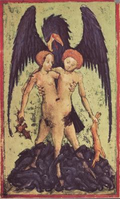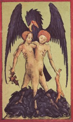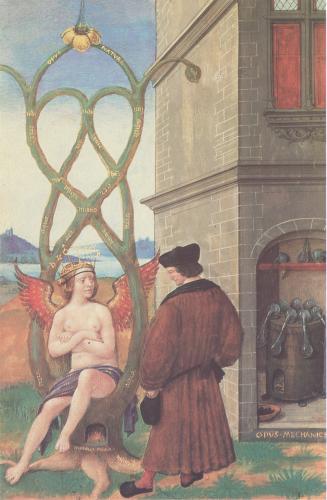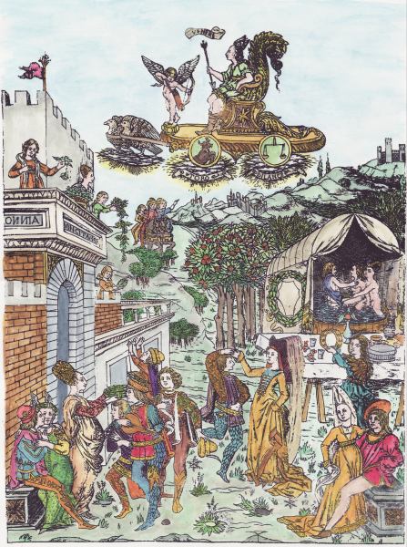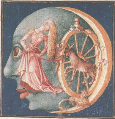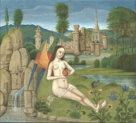 Many illuminated manuscripts are religious in nature, being Books of Hours or other devotional tracts. There must be tens of thousands of Books of Hours preserved in libraries and private collections, and they regularly appear in fine art auctions. During the 14th and 15th centuries there arose a class of people who became relatively wealthy, and one way they could display their status and wealth was to have scribes and illuminators prepare a lavish personal book of devotion. Apart from a few notable examples, I find the content of most of these, though often having amazingly beautiful paintings within them, does not truly engage me. However, there was arising in that time other more secular works, which often allowed the artist a freer expression outside the straightjacket of the formulaic Book of Hours. Thus we find a number of manuscripts with illuminations of Dante, Boccaccio, and even stories such as the Roman de la Rose, Tristan and Isolde. Ovid's Metamorphoses provided a opportunities for the artist/illuminators to explore emblematic material. Here is a beautiful example of Hermaphoditus and the nymph Salmacis from a manuscript of the Metamorphoses in the Bibliotheque Nationale. Astronomical/astrological works began to appear with many wonderful illustrations, even a particular format depicting the Children of the Planets. The Apocalyse provided a source of powerful emblematic imagery and many manuscripts appeared exploring this theme. We also find manuscripts depicting the Triumphs of Petrarch, processions in which a triumphal chariot is being pulled by various people or animals, and this was so popular a format that the imagery was extended beyond that expressed in Petrarch's poems. Indeed, by the 15th century, manuscript illumination had expanded far outside the formula of religious devotional works. This is what makes the artwork of this period so exciting. There is so much to uncover and explore here.